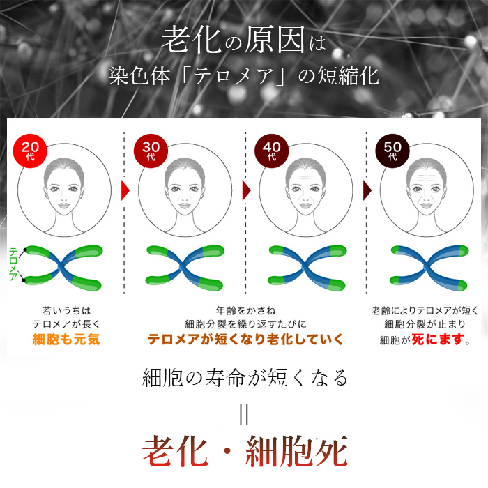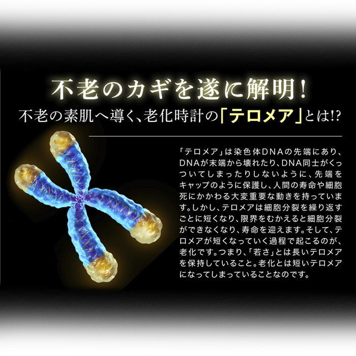 老化の原因は、DNA先端にある染色体「テロメア」の短縮化にあります。