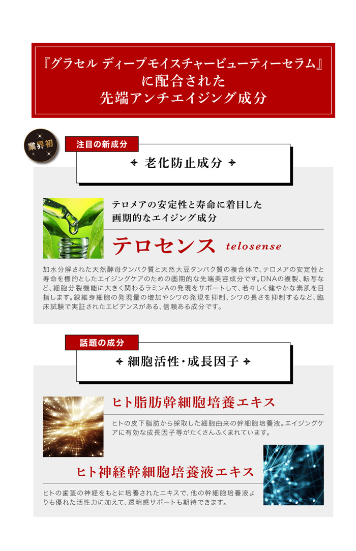 テロセンスが「テロメア」を保護し、肌の老化プログラムを減速させ、細胞再生力に優れるWヒト幹細胞やグロースファクターなど厳選配合された美肌成分が老化原因を根本から阻止します。