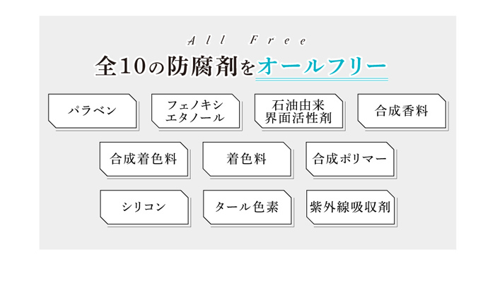 (パラベン・エタノール・界面活性剤・シリコン・タール色素・紫外線吸収剤・香料・着色料・合成ポリマー)