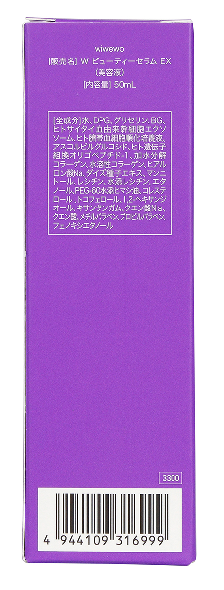 水、DPG、グリセリン、BG、ヒトサイタイ血由来幹細胞エクソソーム、ヒト臍帯血細胞順化培養液、アスコルビルグルコシド、ヒト遺伝子組換オリゴペプチド-1、加水分解コラーゲン、水溶性コラーゲン、ヒアルロン酸Na、ダイズ種子エキス、マンニトール、レシチン、水添レシチン、エタノール、PEG-60水添ヒマシ油、コレステロール 、トコフェロール、1,2-ヘキサンジオール、キサンタンガム、クエン酸Na、クエン酸、メチルパラベン、プロピルパラベン、フェノキシエタノール