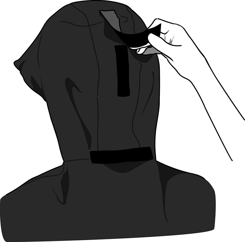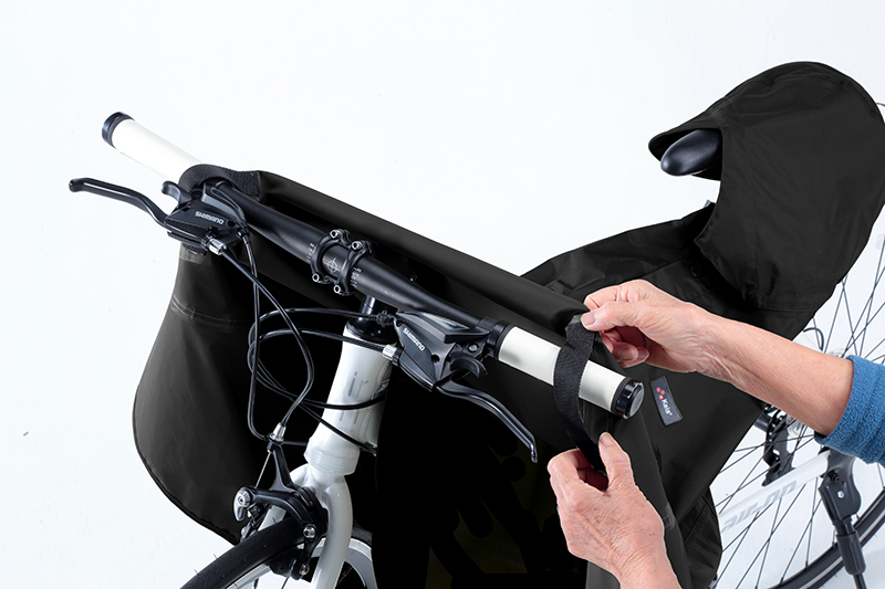 *レインポンチョ裏側の左右2箇所のベルトに手の指を通して、ハンドルグリップを握るとポンチョの前面のカバーが風でめくれ上がらずにしっかり膝を雨から守ってくれます。